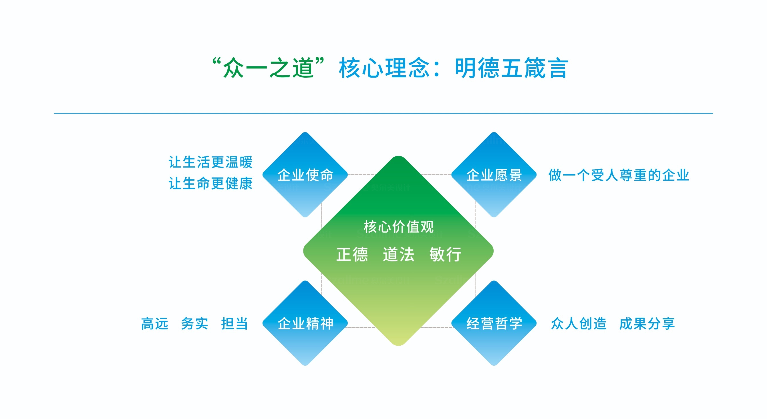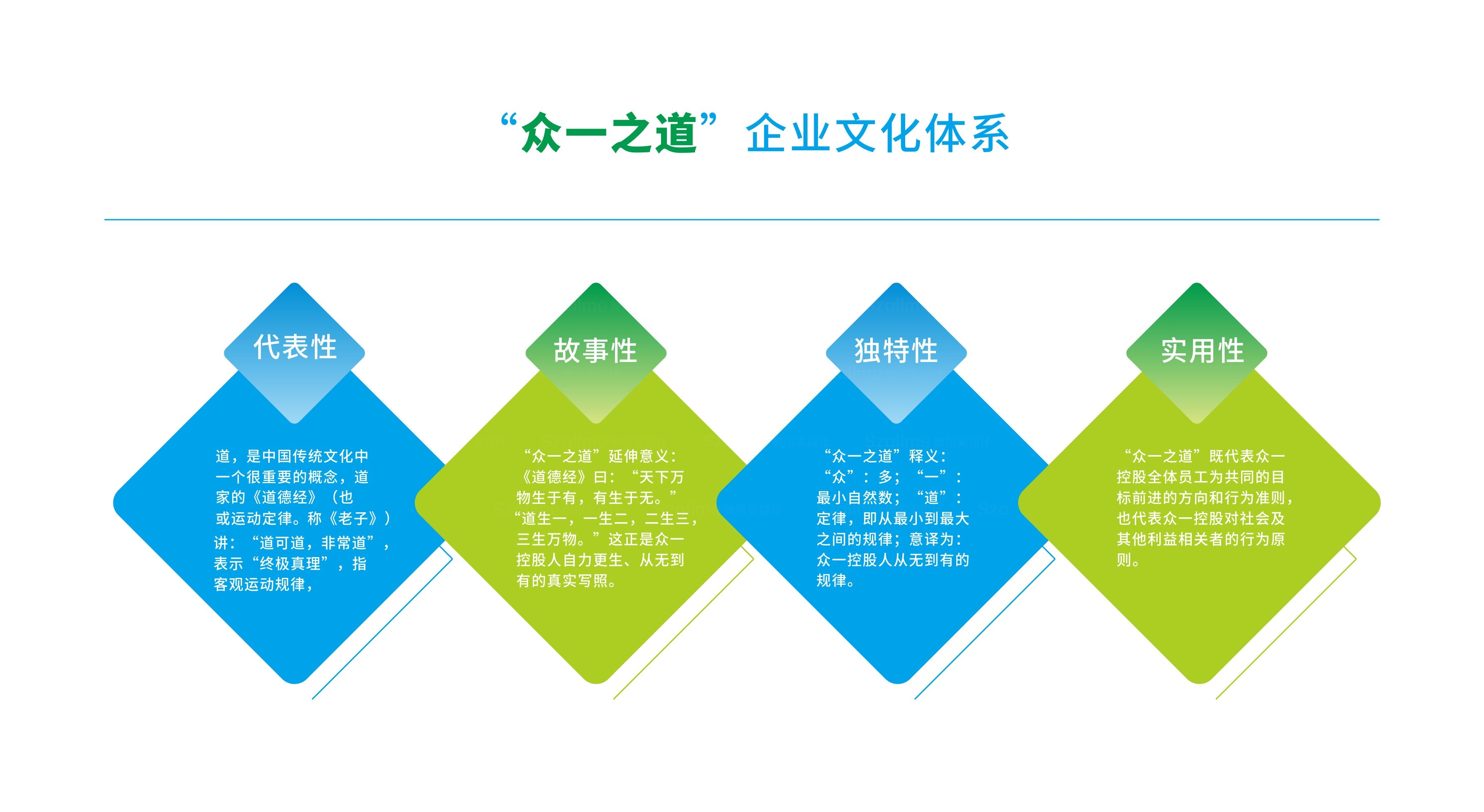 標(biāo)識中的主色調(diào):綠色,代表大地,環(huán)保的含義,寓意眾一控股關(guān)注環(huán)保,關(guān)愛健康。標(biāo)識中的輔助色:白色,代表人,純潔的含義,寓意眾一控股人干凈做人,踏實做事。三種色彩組合代表天.地、人,寓意天時、地利、人和,形成眾一控股成功的關(guān)鍵要素。