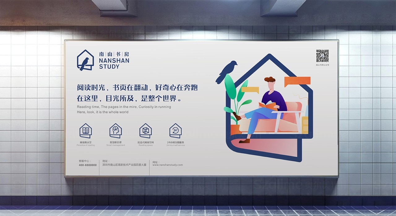標志傳遞一種樂觀向上、有行業特點的品牌視覺,南山書房不僅是一處文化體驗場所,也是一座城市的“心靈燈塔”,為更多都市年輕人在繁忙工作之余,提供了一方安靜而舒適的閱讀凈土,打造城市精神生活的美好棲息地。