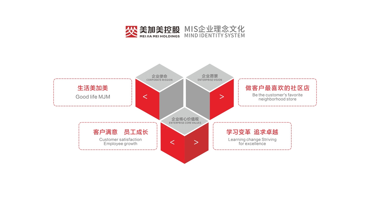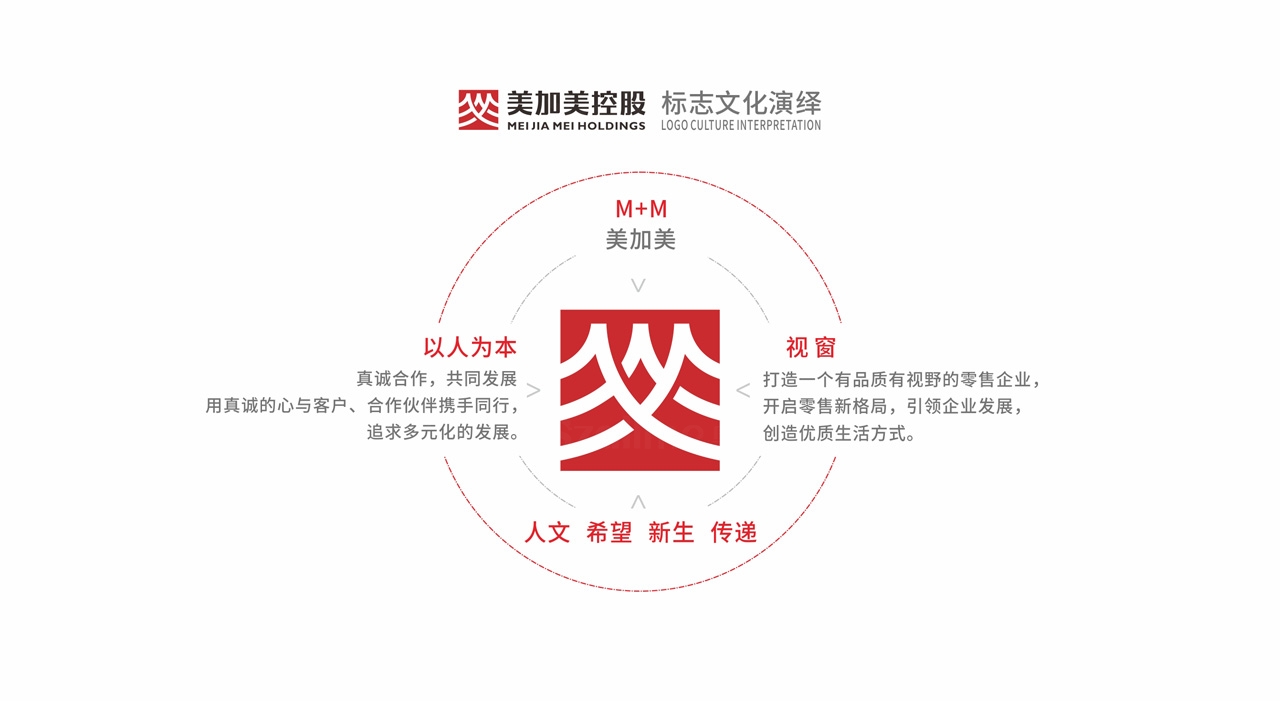 美加美控股品牌為了突顯競爭力、與同行形成差異。在品牌形象設計過程中,借鑒其名英文名稱“MEI JIA MEI"中的首母“M+M" 創作元素,全新的品牌識別設計力求國際化,整體簡約,平易近人,投射創新、年輕、活力的品牌形象, 體現公司穩健發展和品牌領先的企業形象。