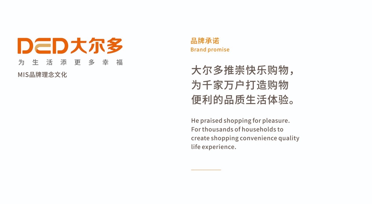 品牌用“DED”作為品牌視覺符號,體現品牌的國際視野和年輕活力的品牌個性,我們力求創新與個性,反應品牌的創新力和敢為人先的精神,加強品牌與顧客的情感聯系。字母的設計有開放和連接的視覺感,寓意共創同享,做一流品牌,創百年企業,打造全新多元化的商業體系。